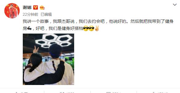 1月7日,谢娜更新了社交动态,晒出了和老公张杰的背影合照,并配文写道:我讲一个故事,我跟杰哥说,我们去约会吧,他说好的。然后就把我带到了健身房,好吧,我们是健身好搭档。原来两人是去锻炼身体去了,只是这约会到健身房倒是别有心裁。