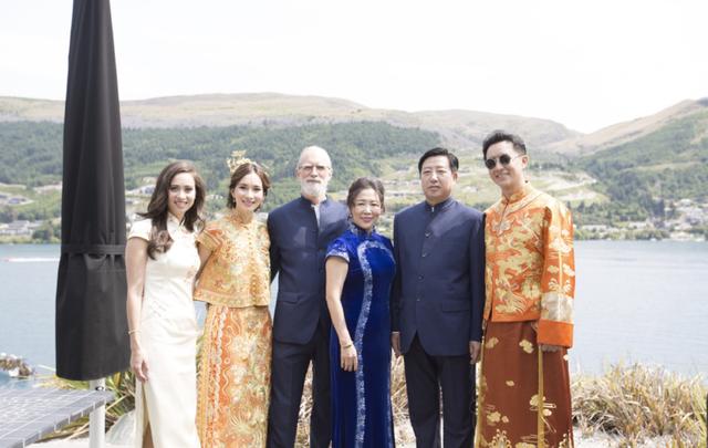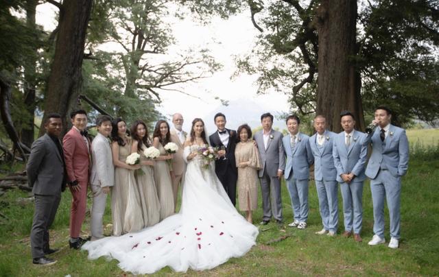 婚礼仪式是在草地上举行的,双方父母、伴郎、伴娘站成一排,留作纪念。