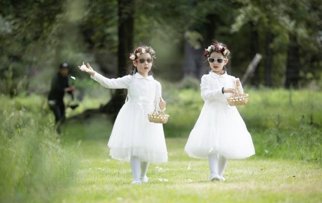 婚礼上的两个小花童穿着公主裙,戴着墨镜,十分可爱。