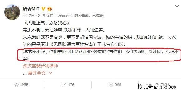 唐爽发文:想要求我和解,你们去问问14万万同胞是否答应!看你们一伙继续跳继续闹,忍俊不禁!唐爽的发文很有力度,而且表示周立波他们一伙人想要求和了。