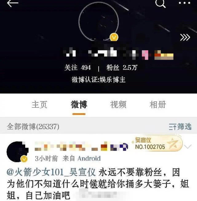 也影响到了吴宣仪在大家心目中的形象,毕竟,粉丝行为,偶像买单。吴宣仪的大粉随后发微博表示任何时候都不能够靠粉丝,因为你永远都不知道她们会做出什么事情。真的就是成也粉丝,败也粉丝吧,吴宣仪现在的发展离不开粉丝的支持,只是,给她造成了负面影响的,也是她的粉丝。