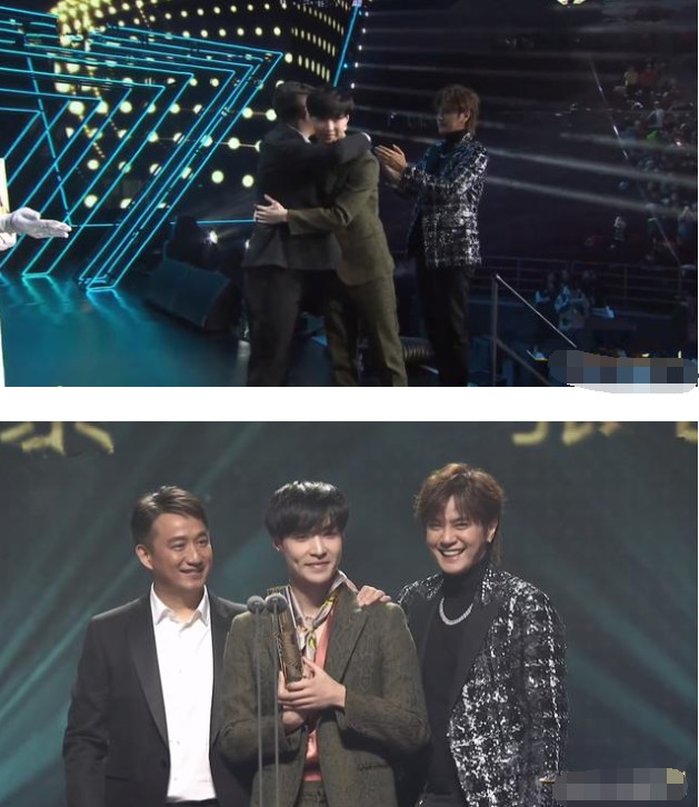 再说说秀恩爱的,极限挑战的男人帮集体秀恩爱,张艺兴和罗志祥的“猪羊”组合再度合体,跟着师傅黄磊上台颁奖去了,三个男人搂搂抱抱还真是亲昵。