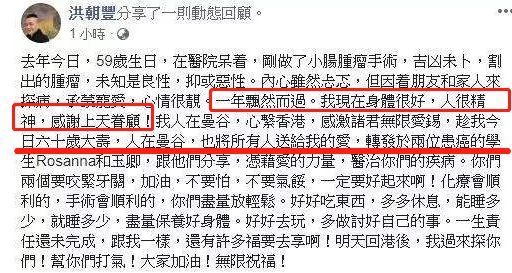 近日,港媒更新了洪朝丰的最新动态。适逢洪朝丰60大寿,他在社交网站上发表了长篇抗癌感言,还鼓励身边的两位患癌学生要积极去面对。