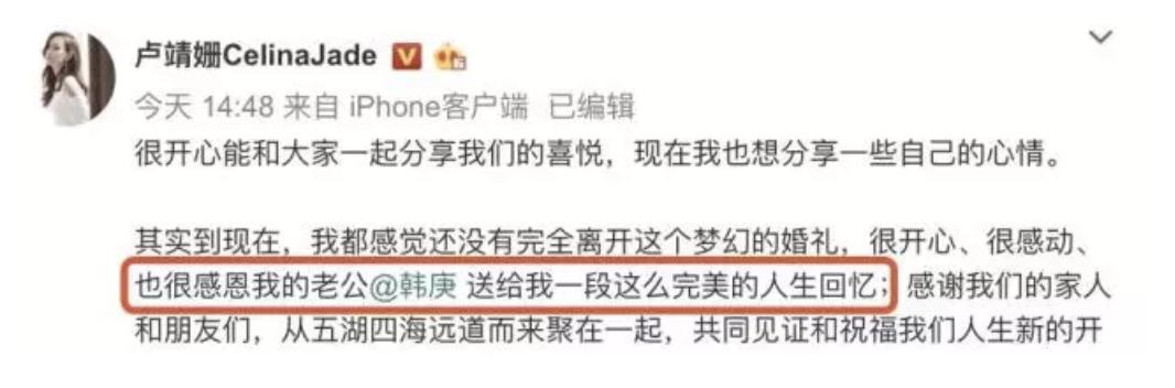 前几天的时候,卢靖姗才迟缓的晒出当时结婚的照片。在配文中她特别感谢老公韩庚送给她一段这么完美的人生回忆。