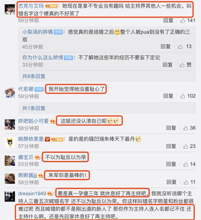 很多吃瓜群众纷纷留言,觉得朱丹已经把自己的不专业当有趣了,叫错名字这个梗真的不好笑,如果真的一孕傻三年,就休息好了再出来主持吧,甚至还有网友认为朱丹没有羞耻心。