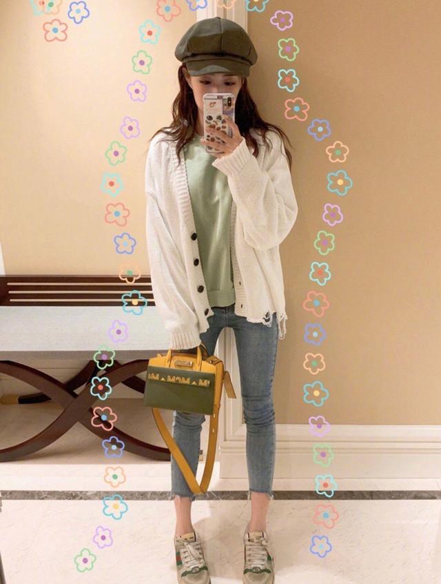 针织开衫自带的温柔舒适感,对任何身材的女生都特别友好。徐璐浅绿色圆领卫衣外搭白色开衫,9分铅笔仔裤配脏脏鞋,军绿色邮差帽点缀,复古灵动的小公主造型美极了!