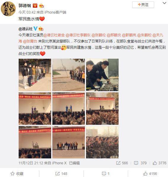 当时,郭德纲还转发了这条微博,称“军民鱼水情”。