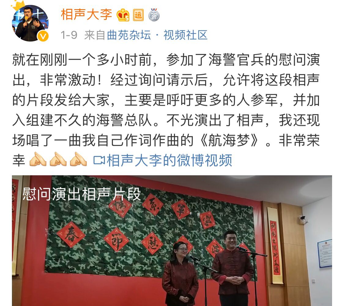1月9日,公式相声创始人、交大博士李宏烨发文称,自己参加了海警官兵的慰问演出,非常激动。