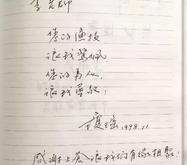李明启老师的敬业感动了琼瑶,在写给李老师的留言中,琼瑶说道:“李老师,您的演技让我敬佩,您的为人让我尊敬。感谢上苍让我们有缘相聚。”