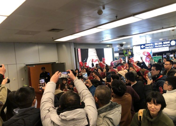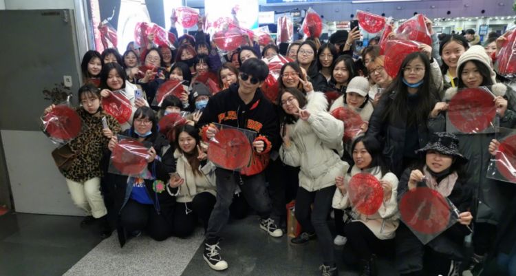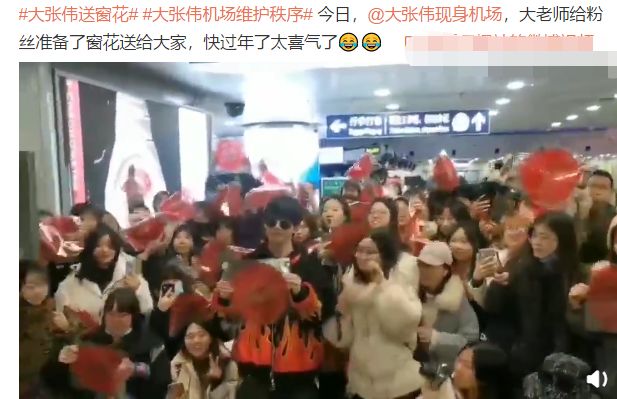 在和粉丝们打完招呼后,大张伟开始维持秩序,同时还拿出了自己准备的剪纸窗花,挨个给粉丝们发,粉丝们也很遵守秩序,排起了长长的队伍,一个接一个接过大张伟手里的窗花。之后大家一起合影留念非常欢乐。