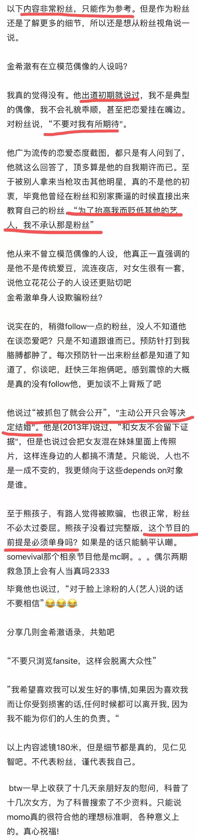 不过,也有金希澈的粉丝出来表示,并不觉得金希澈立人设过度,也没有觉得被欺骗。姐也表示很认可,毕竟每个人立场不同滤镜不同。