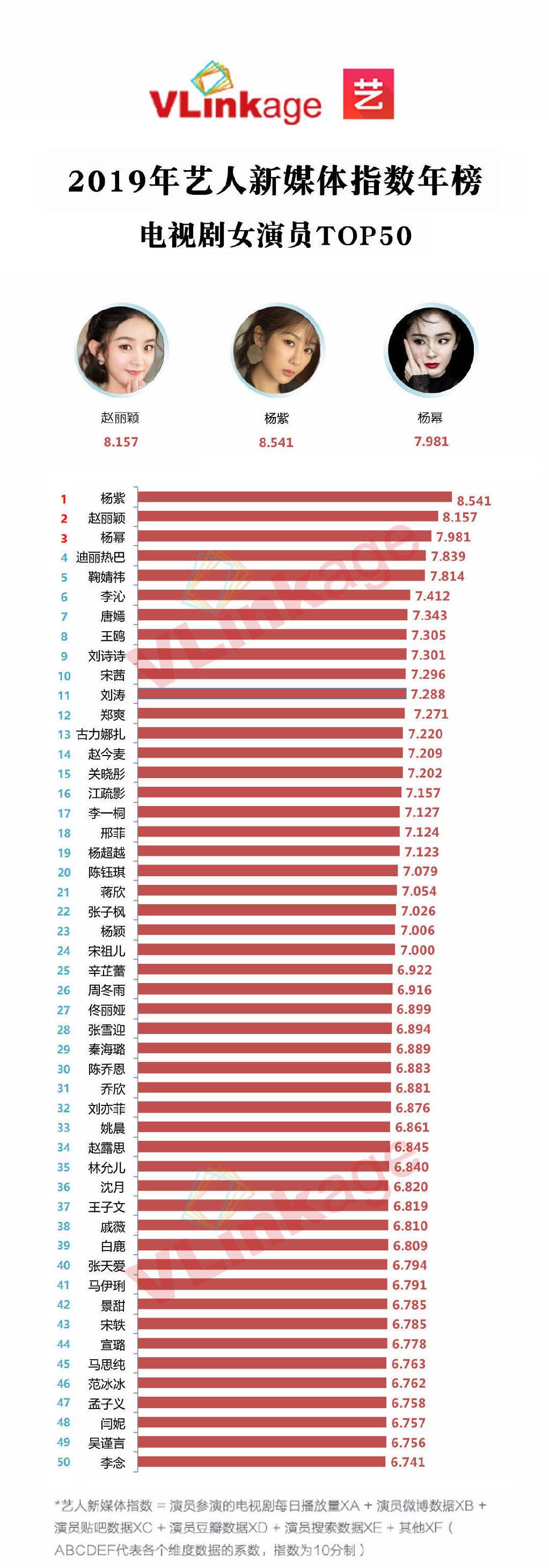 今日一份2019年艺人新媒体指数年榜电视剧女演员TOP50公布,这份被网友们称为“V榜”的榜单每年伊始都会如期公布,与如今大小榜单满天飞的窘况不同,这份榜单在网友们心目中是有一定信服力和权威性的。如果简单的概括这份榜单,那就是“四杨双丽”名不虚传,杨紫名列榜首,杨幂排第3,杨超越第19,杨颖第23,赵丽颖居第2,迪丽热巴排第4。