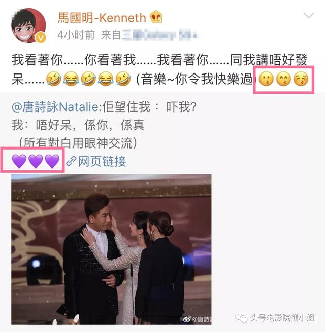 然后,马国明转发了这条内容,写道:“(原为广东话,改写为普通话)我看着你……你看着我……我看着你……对我讲不要发呆……(音乐~你令我快乐过)”后面发了三个亲亲的表情。