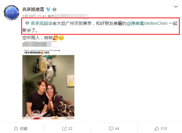与此同时,言承旭的粉丝团也是晒出了此次言承旭与陈美凤的合影,配文中更是透露了两人之间是“朋友关系”。