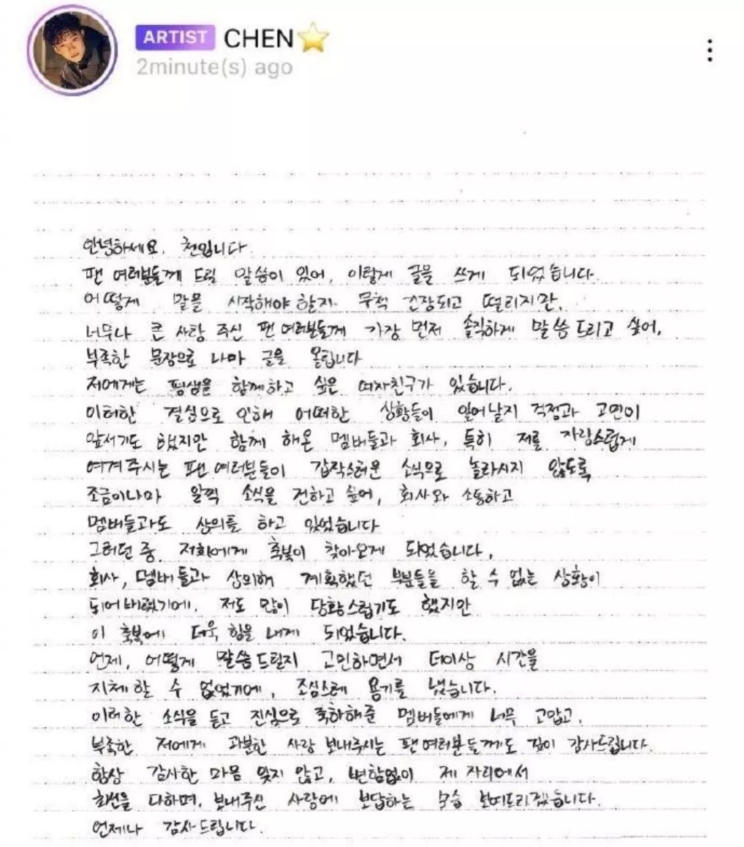今天金钟大发出自己的手写信,承认了自己的恋情。