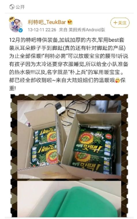 利特的中国粉丝曾经给韩国军队送过暖宝宝、腰带以及其他军用套装。