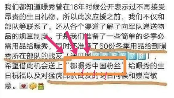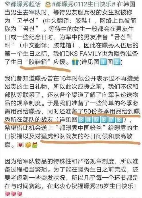 1.12号是都暻秀28岁生日,部分粉丝为了给都暻秀庆生,和部队取得联系之后给猛虎部队送去了应援。