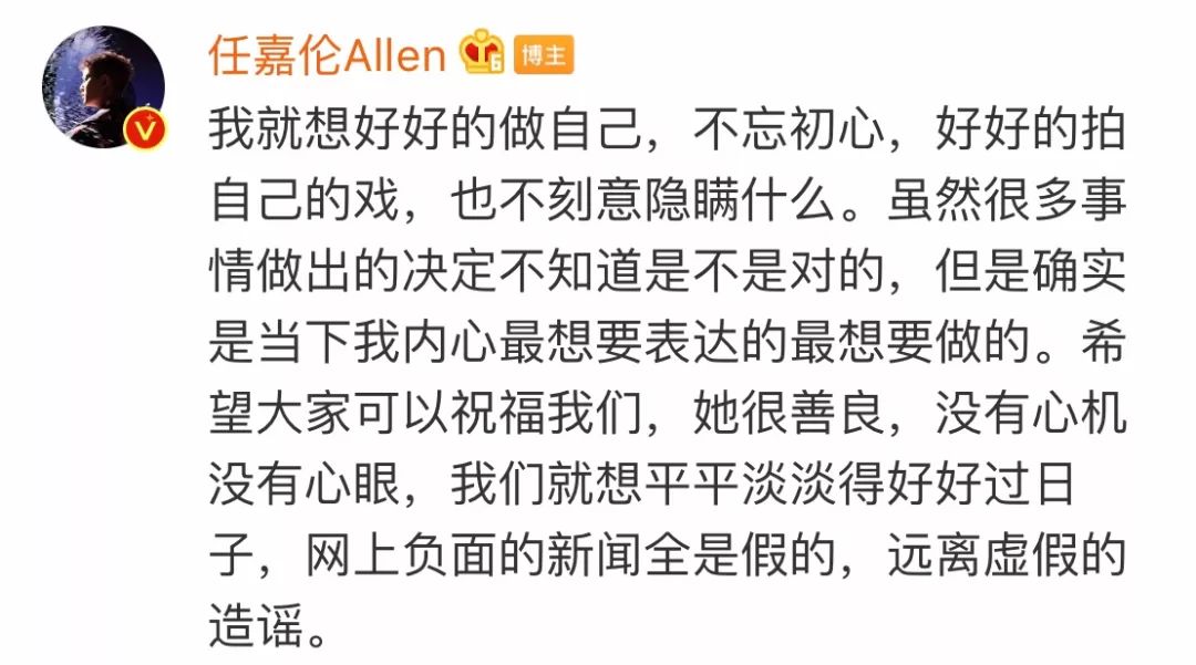而就在粉丝为他事业上担惊受怕的时候,任嘉伦在微博上回复大家:就想好好做自己,不忘初心,不刻意隐瞒什么
