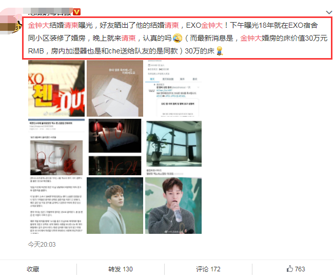 先来看下此次传出的解约消息,网上传出的消息称某品牌在2月29日将要与代言人EXO解约,虽然并未说明是否因为金钟大结婚一事有关,但在如此巧合的时间被曝出解约,自然也是不免让人多想。