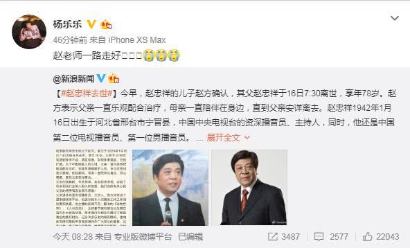 杨乐乐平时和赵忠祥没有太多交集,不过赵老师的节目影响了杨乐乐,给了她很多启示,所以杨乐乐也是在微博上悼念赵忠祥,发文称:赵老师一路走好。