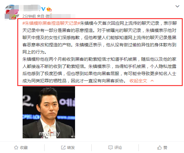 此次朱镇模在回应不雅聊天记录时,表示有一部分是黑客捏造的,同时也对聊天记录中提及到的女性感到抱歉,由此也是不难看出,关于聊天记录中的一些内容,朱镇模本人默认了,不过具体那部分内容是捏造的却并未提及。