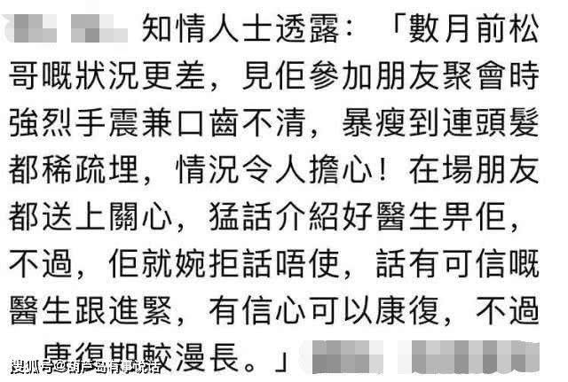 有知情人士透露,其实刘松仁在数月前状况更差,参加朋友聚会时甚至强烈手抖和口齿不清,当时他不但暴瘦且头发稀疏,身体看起来不大好。