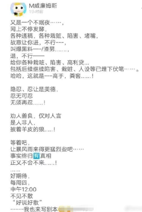 周三的爆料不知会不会震撼,但周四的中午十二点恐怕是不容错过的。郑爽的前男友回归微博了,而且他还在社交媒体上预告要爆郑爽的料。张恒的大致意思就是自己被各种陷害、栽赃。他现在已经忍无可忍,甚至还在博文中疑似内涵郑爽是披着羊皮的狼。