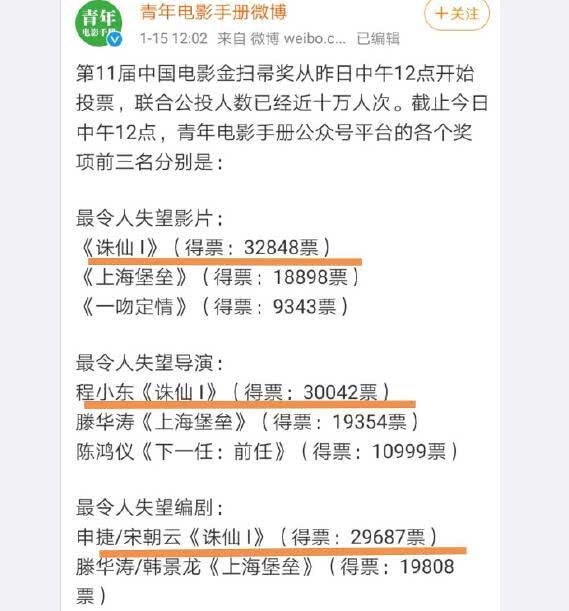 最后金扫帚奖的颁奖仪式也会在2020年3月的第十一届中国电影金扫帚奖上进行现场公布,但是从由于诛仙剧组的得票数实在是太高了,估计得奖已经是十拿九稳了。