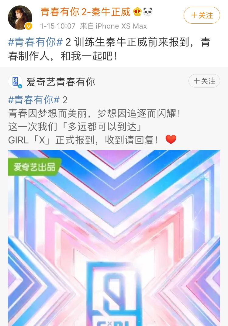 原来,今天秦牛正威转发了青春有你2的官方微博,坐实了自己要参加选秀的消息。