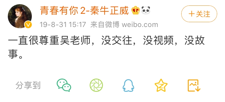 为了自证清白,秦牛正威后来还发博称“一直很尊重吴老师,没交往,没视频,没故事”。