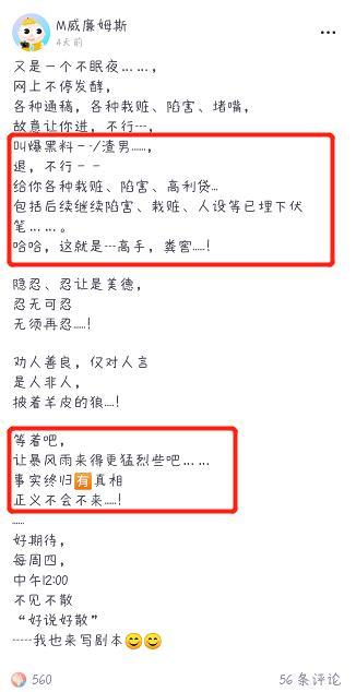 而在此之前,这个账号还发了称预告每周四中午十二点不见不散的开撕宣言,因为各种黑料、栽赃、陷害、高利贷下他终于忍无可忍,决定无需再忍,让这场暴风雨来得更猛烈些。而由这些关键词也可以推断出这个人应该是在针对郑爽。