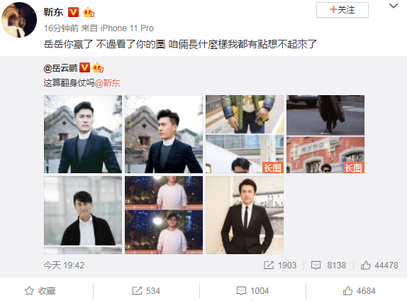而随后岳云鹏果然打了个“翻身仗”,晒出了一组自己和靳东的照片,从这些照片看岳云鹏变得帅气了很多,和靳东差别也不太大了。