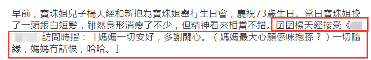对此也是有媒体采访了陈宝珠的儿子杨天经,杨天经在接受采访时也是直言“妈妈一切安好,谢谢关心”,同时在被问及“陈宝珠最大的心意是否是抱孙子时”,杨天经也是笑着回复“一切随缘,妈妈没说,哈哈”。