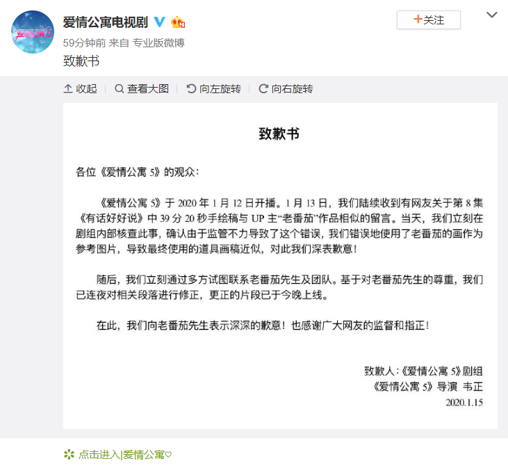 1月15日夜晚,正在热播的《爱情公寓5》在线观看(✪ω✪)导演韦正在微博上发文致歉,他就《爱情公寓5》第8集单元故事《有话好好说》在线观看(✪ω✪)中,片段与UP主“老番茄”作品相似一事表示歉意,韦正称:已在剧组内部核查此事,确认由于监管不力导致了这个错误,我们错误地使用了老番茄的画作为参考图片,导致最终使用的道具画稿近似,对此我们深表歉意!
