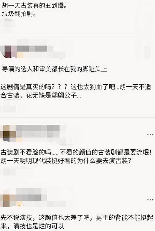 其中被吐槽最严重的就是胡一天了,他作为现代剧中的男神人物,忽然换上古装蛮让人惊喜。然而,身穿古装的胡一天竟然被不少人吐槽扮相丑,毁掉自己心目中花无缺的形象了。