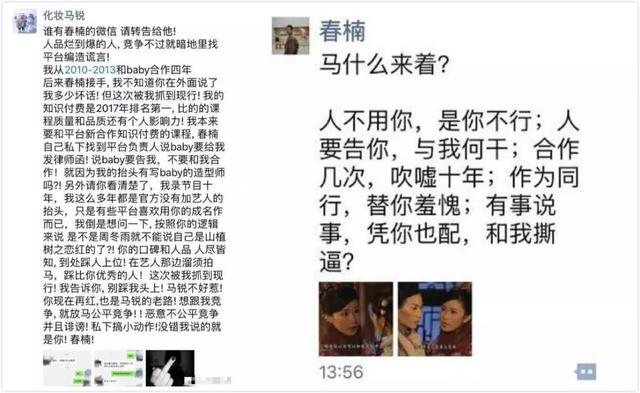 春楠广为人知的热点新闻,是在2019年签约成为Angelababy长期化妆师,与Baby上一任化妆师马锐公开撕破脸的事件。马锐曾经与baby合作了四年,期满后不再续约,随后在自己的朋友圈发了长文,隐射春楠做小动作诽谤自己。而春楠也毫不示弱,在朋友圈对马锐进行有力回击。