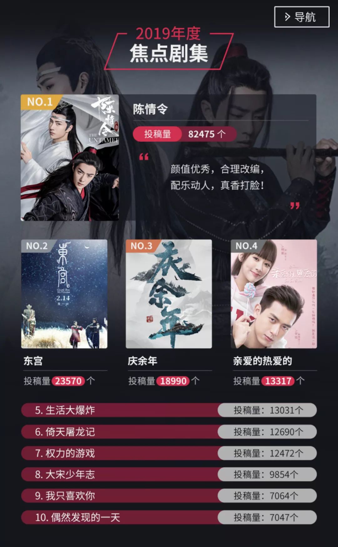 有点意外的是《庆余年》在线观看(✪ω✪)的劲头真的很强,明明是11月底才播出的,投稿量竟然可以排到第三名。从这些剧的投稿数都可以看出粉丝们为爱发电的能力真不容小觑哈。