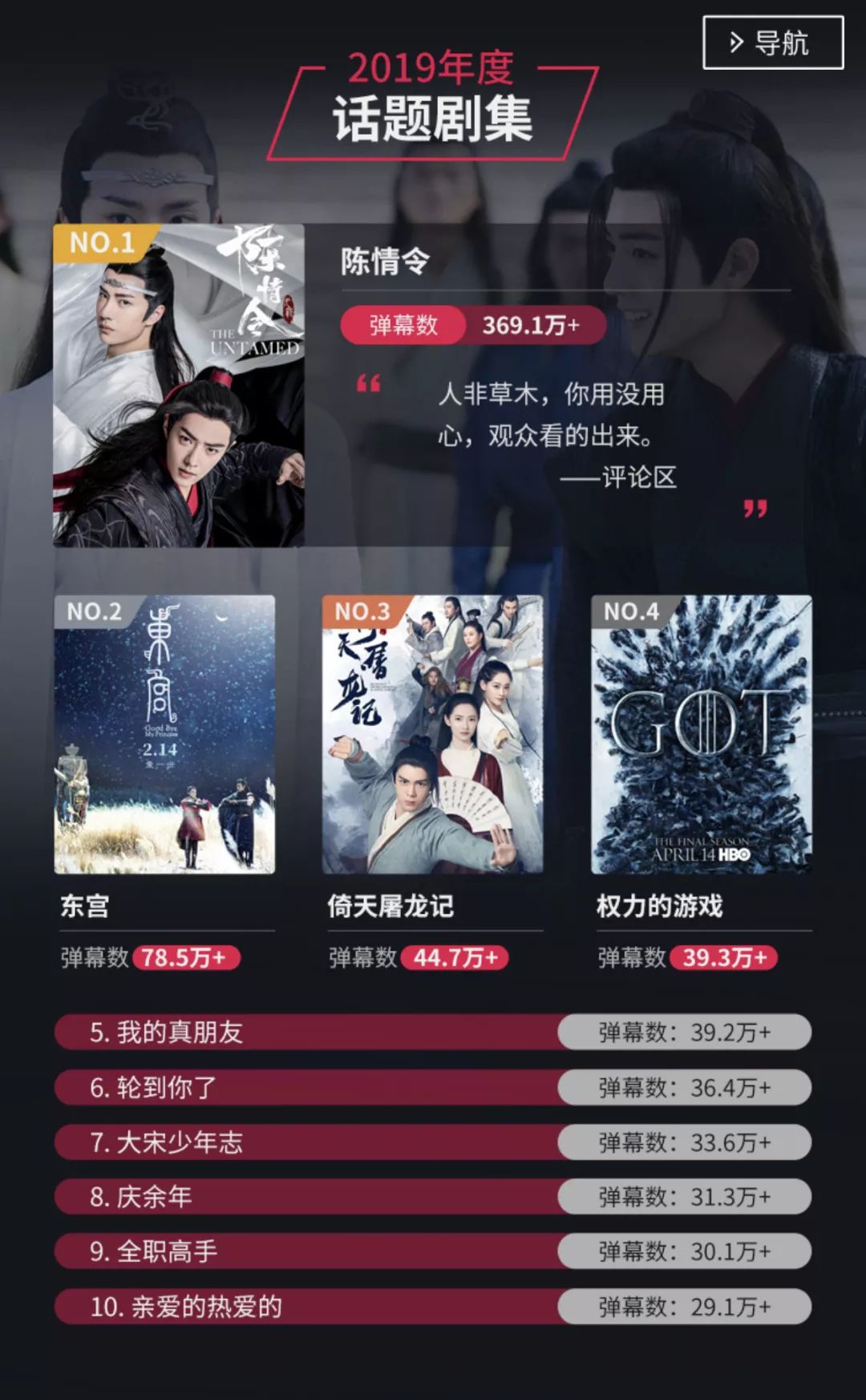 话题剧集和焦点剧集榜单上的剧相差不大,不过《陈情令》在线观看(✪ω✪)的弹幕真·一骑绝尘,369.1w+的弹幕超过了其他9部剧的总和,这句来自评论区的“人非草木,你用没用心,观众看的出来”真是对粉丝们的真情实感最好的概括了吧。
