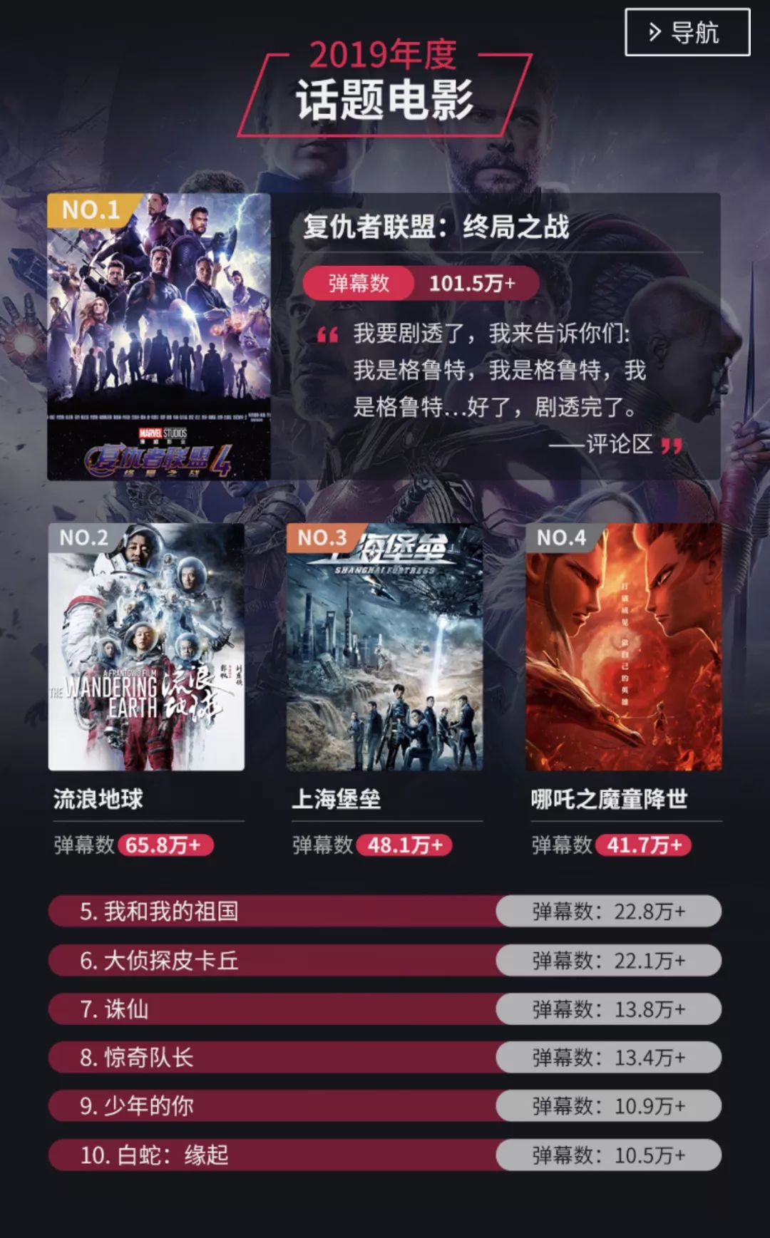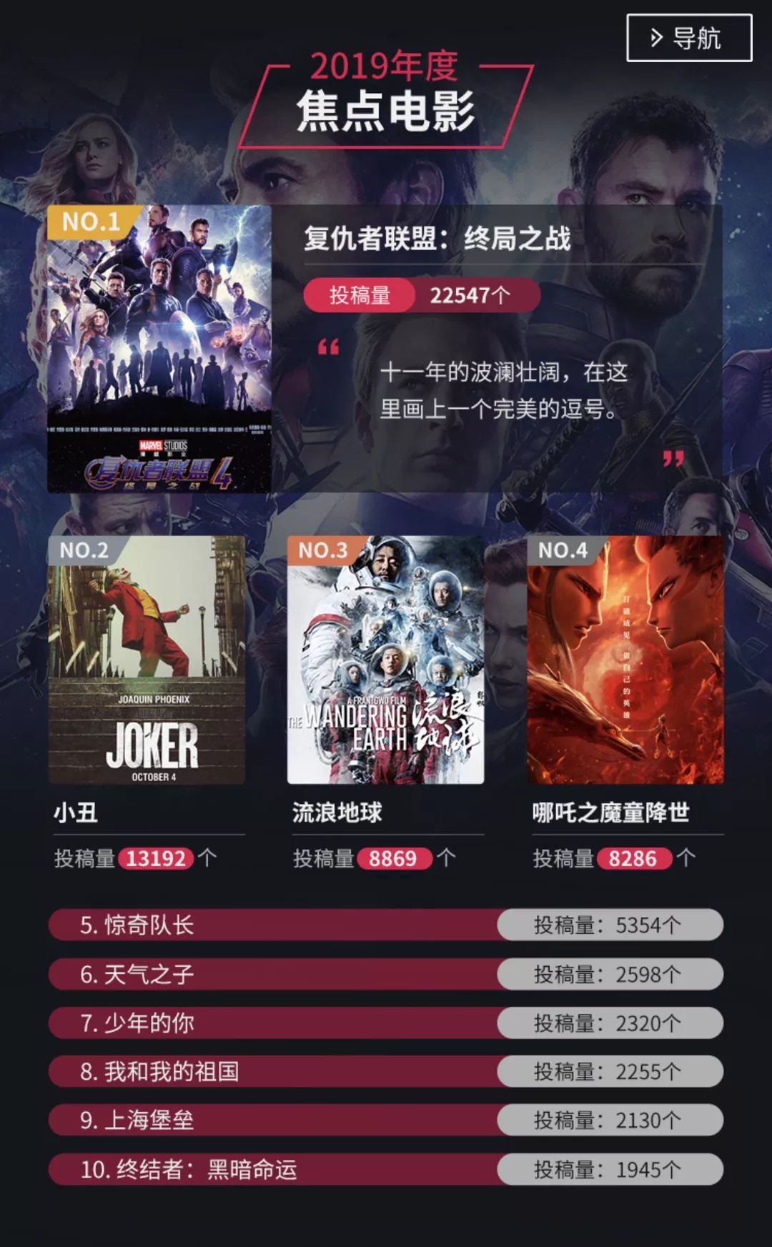 第一名复联4当之无愧,总结语十分贴切,“十一年的波澜壮阔在这里画上了一个完美的逗号”。还有关注度倍儿高的《小丑》、开启中国科幻电影新时代的《流浪地球》在线观看(✪ω✪)、四十多亿票房的top国产动画电影《哪吒》在线观看(✪ω✪)等个个拎出来都能说一篇推文。