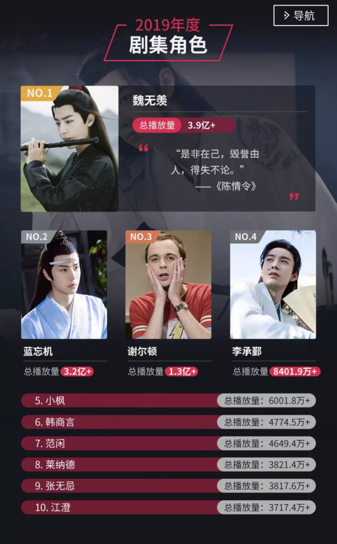 剧集角色中,《陈情令》中的两位主角播放量高得惊人,加起来都破了7亿,真实瑞思拜!