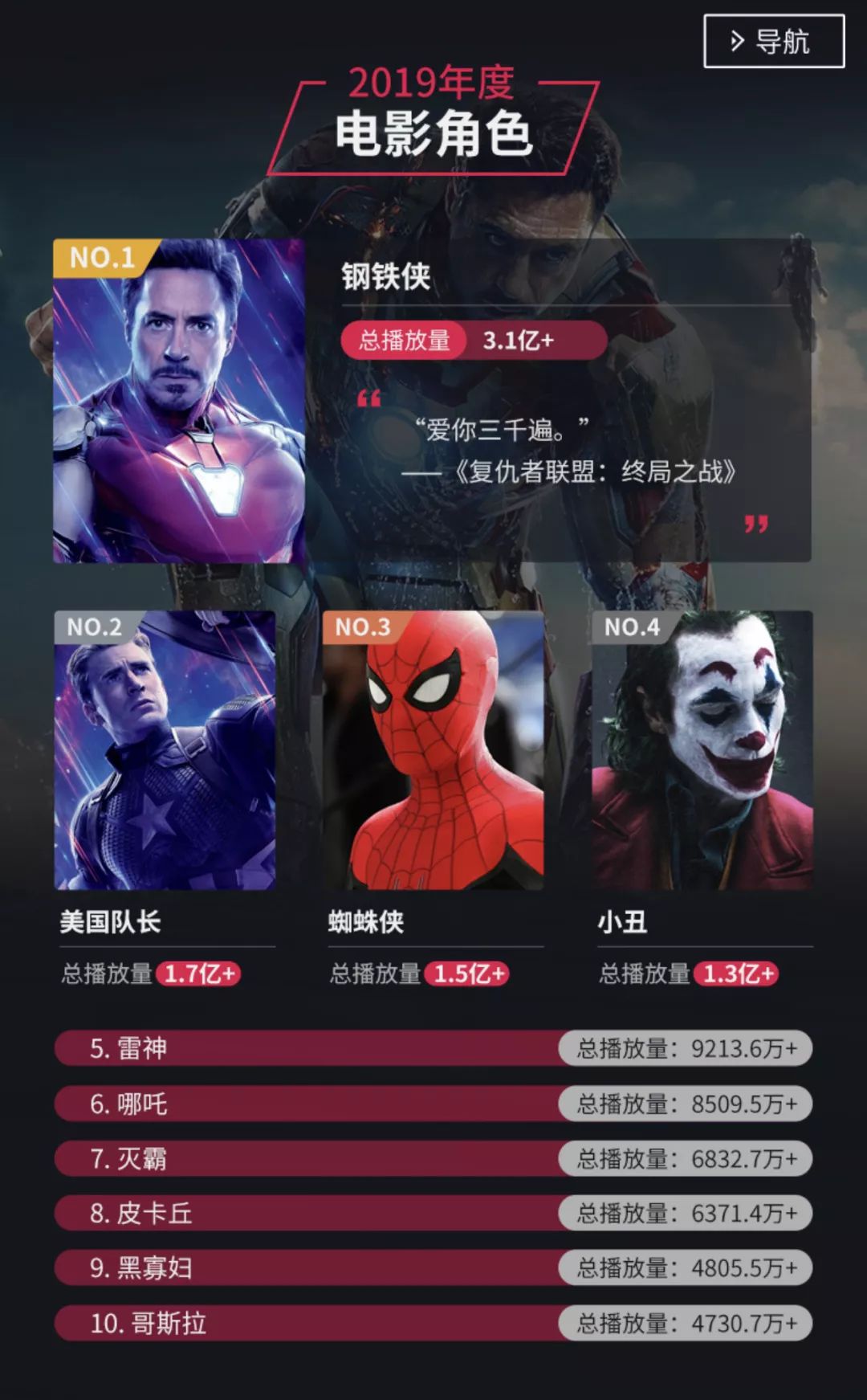 年度电影角色全都出自热门电影,复联4播出后钢铁侠的这句“love you three thousand”又成为了多少人的信仰啊~漫威的力量还是很强大,都快承包整张榜单了。