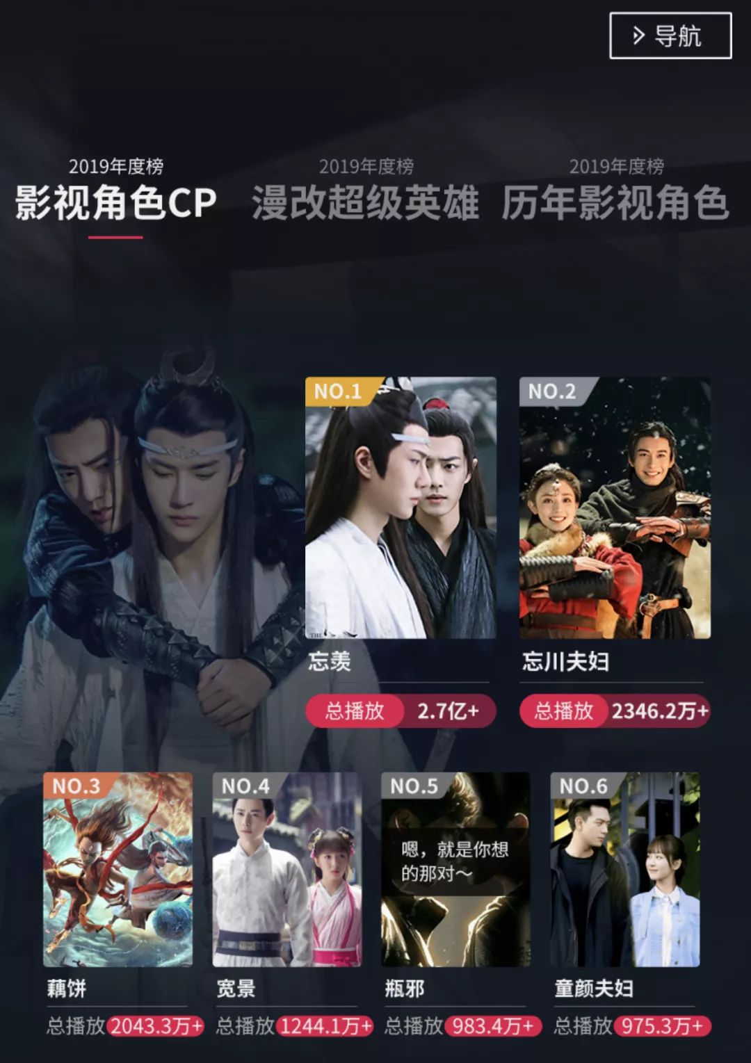 还有一个不得不提的榜单就是影视角色cp榜,BL和BGcp倒是很平均各3对。忘羡的数据是真能打,不论是单人角色还是两人的cp播放量都很惊人。