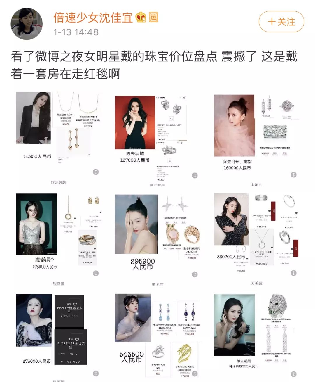 聊到女明星们就不得不提一提最近的微博之夜,有人盘点过她们戴的珠宝价位,全是穿着几套房走红毯啊。