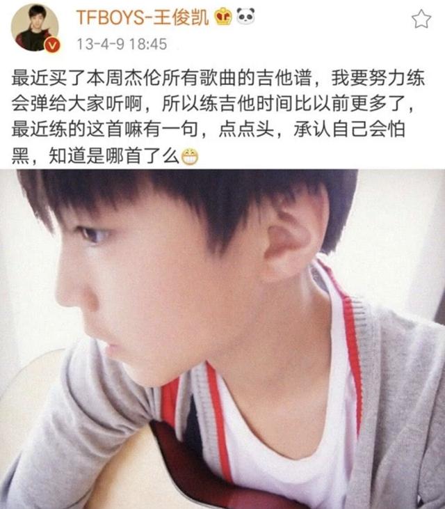 这是偶像为自己的偶像庆生的例子,但王俊凯追星真的是认真的。为了追上自己的偶像,2013年14岁的王俊凯就买了周杰伦所有歌曲的吉他谱。在动态中他说道,要努力练会弹给大家听。