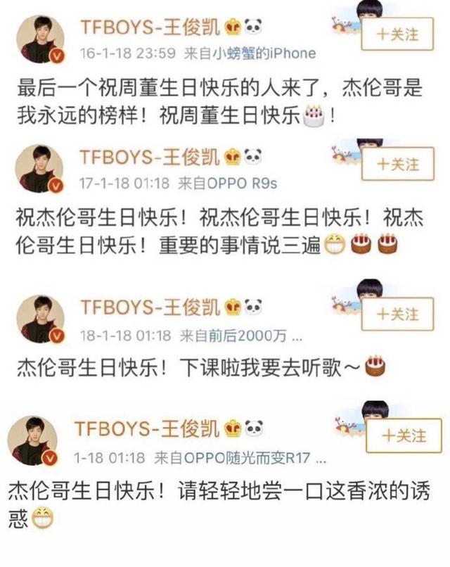 话说这已经是王俊凯连续五年为其庆生了哦,从未成年到成年,把周杰伦奉为自己学习的榜样,越来越优秀,真是满满的正能量。