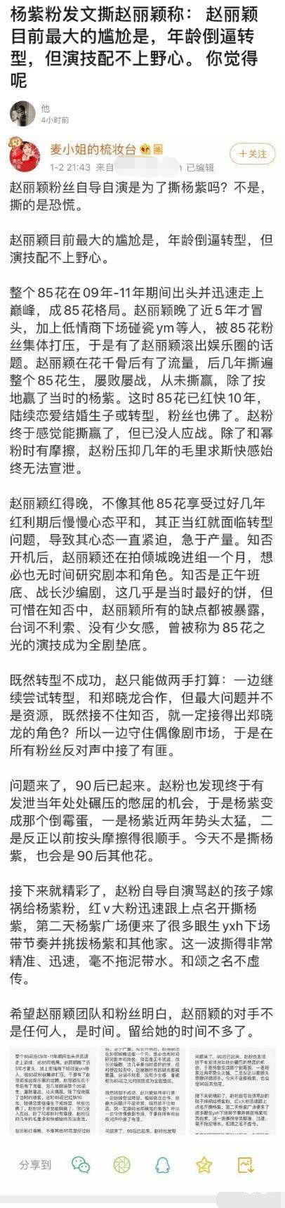 双方粉丝为此已经僵持了数日不下,1月17日网友扒出杨紫粉丝所发布的反击赵丽颖的长文,杨紫粉丝手撕赵丽颖年纪倒逼转型,但演技配不上野心。并且表示,相关诅咒赵丽颖的言论都是赵丽颖粉丝自导自演的行为。