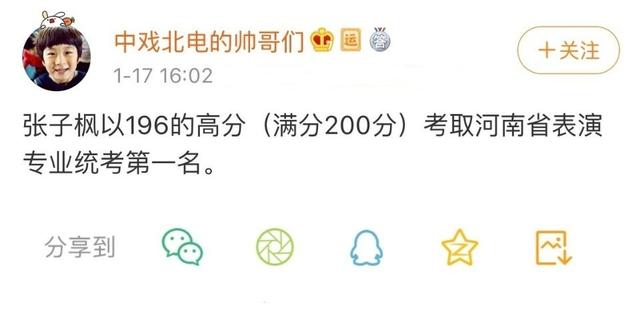 没想到偶遇才曝光了几天,考试成绩就出来了!有网友曝光了她的成绩:张子枫以196的高分(满分200分)考取河南省表演专业统考第一名!