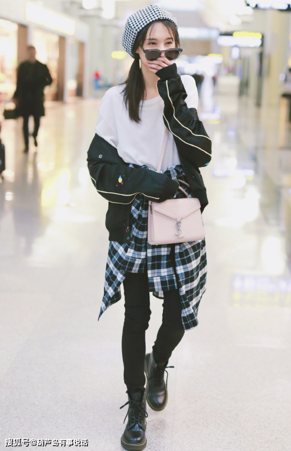 现在郑爽的穿搭风格也是越来越百变了呢,她的这身穿搭就带有一点酷酷的感觉了,复古的贝雷帽为整体的穿搭是很加分的呢,她上身穿了一件白色的T桖,搭配一条黑色的修身裤,简单又好看。