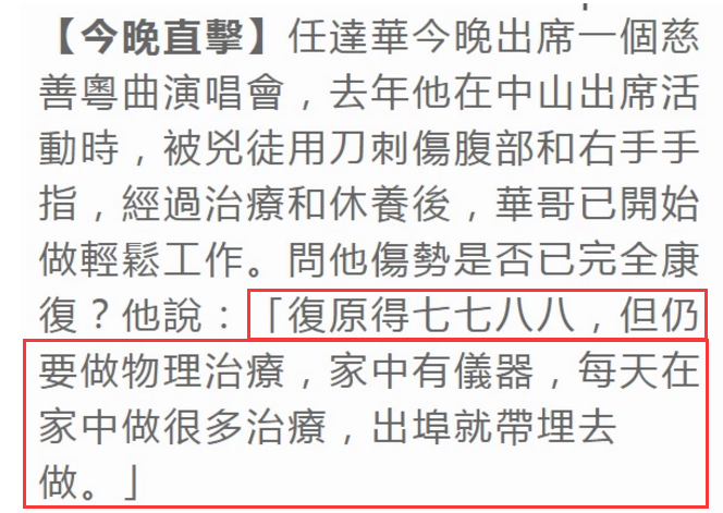 此外,其实关于任达华手伤的恢复情况,前几日任达华在出席某活动时也是有被问到,当时任达华表示已经恢复的差不多,不过依旧要做物理治疗,家里有仪器,每天都做治疗,出去的时候就带着仪器。