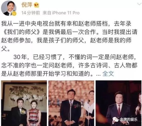 老搭档 倪萍,也发文怀念与赵忠祥老师合作的30年历程,称赵忠祥一直是自己的老师。